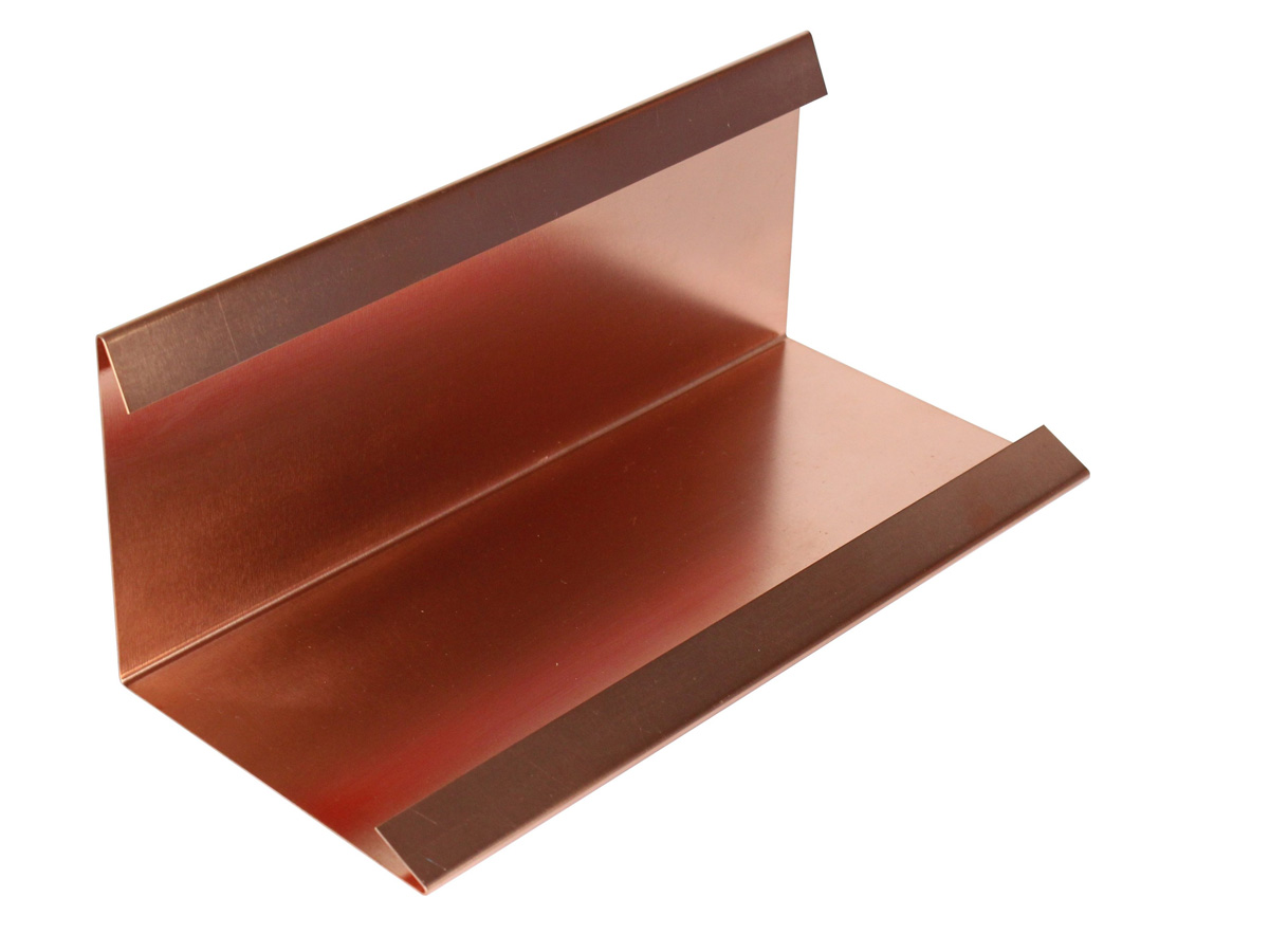 Kupfer Wandanschlußblech, Wandkehlblech auch Wandeinfassung genannt, als Anschluß an seitlich aufgehende Bauteile.