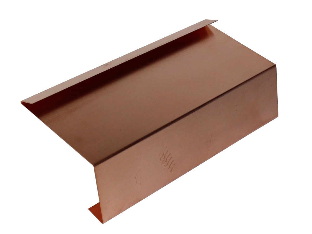 Kupfer Traufblech, Einlaufblech auch Einhangblech, Rinneneinhang oder Traufstreifen genannt, als Verbindung zwischen Dachfläche und Rinne.
