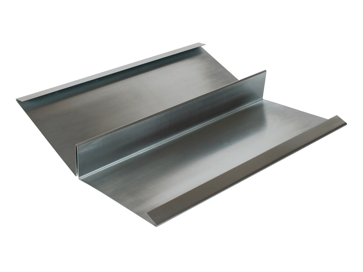 Titan-Zink Kehlblech. Das Kehlbech führt von 2 zusammenführenden Dachflächen das Wasser ab. Der Stehfalz verhindert bei flachen Dachneigungen das überschießen des Regenwassers auf die gegenüberliegende Dachseite. Die Kehlneigung beschreibt die Neigung der Winkel in der Dachkehle von sich berührenden Dachflächen. Dabei gilt prinzipiell: die Kehlneigung ist immer geringer als die Dachneigung.