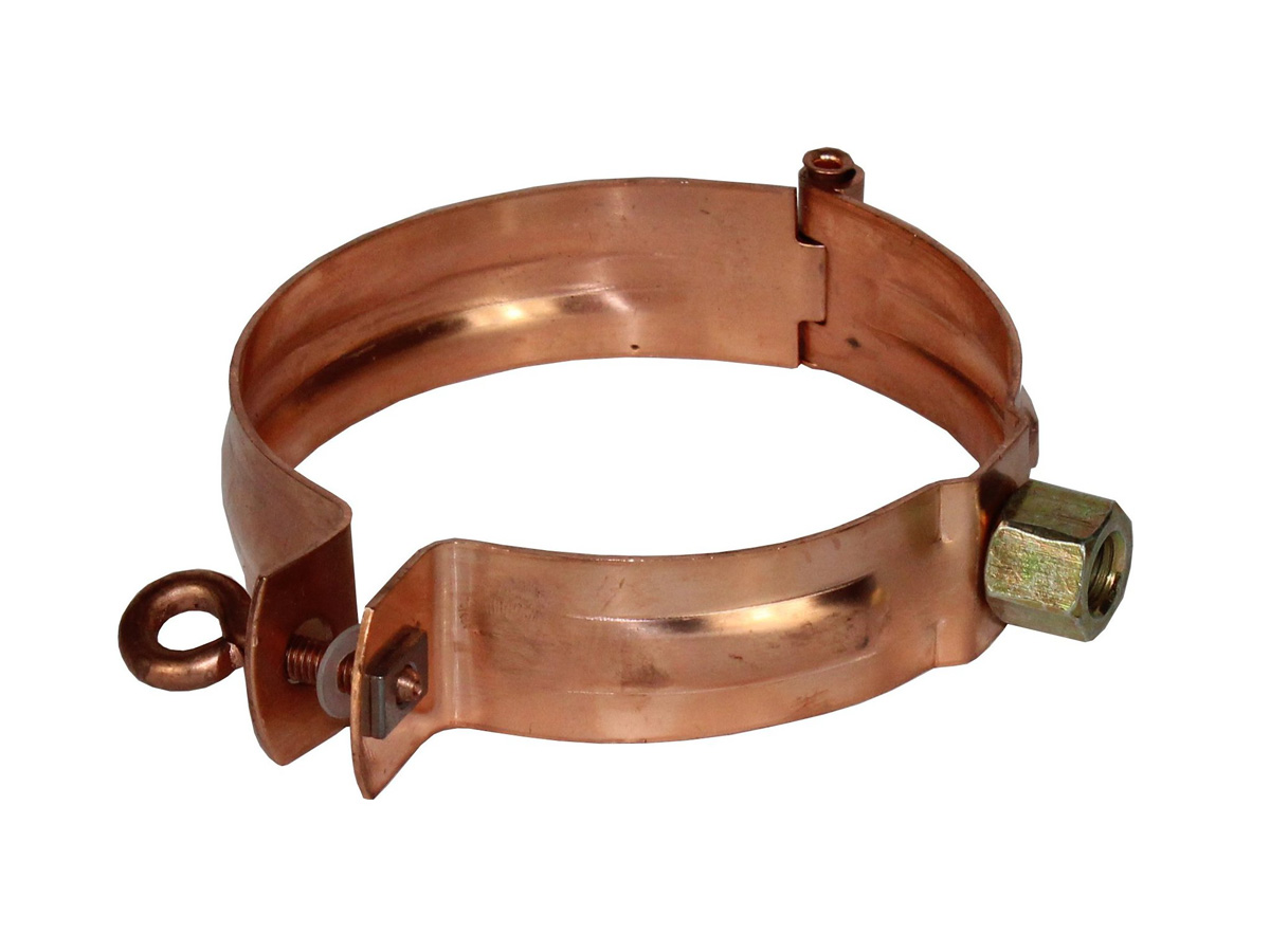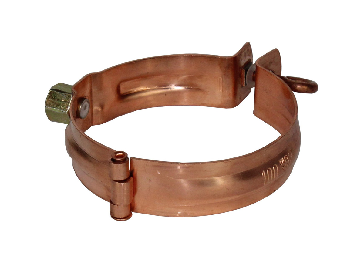 Kupfer Rohrschellen für rundes Fallrohr mit Schanier, Schraube und Mutter M10.